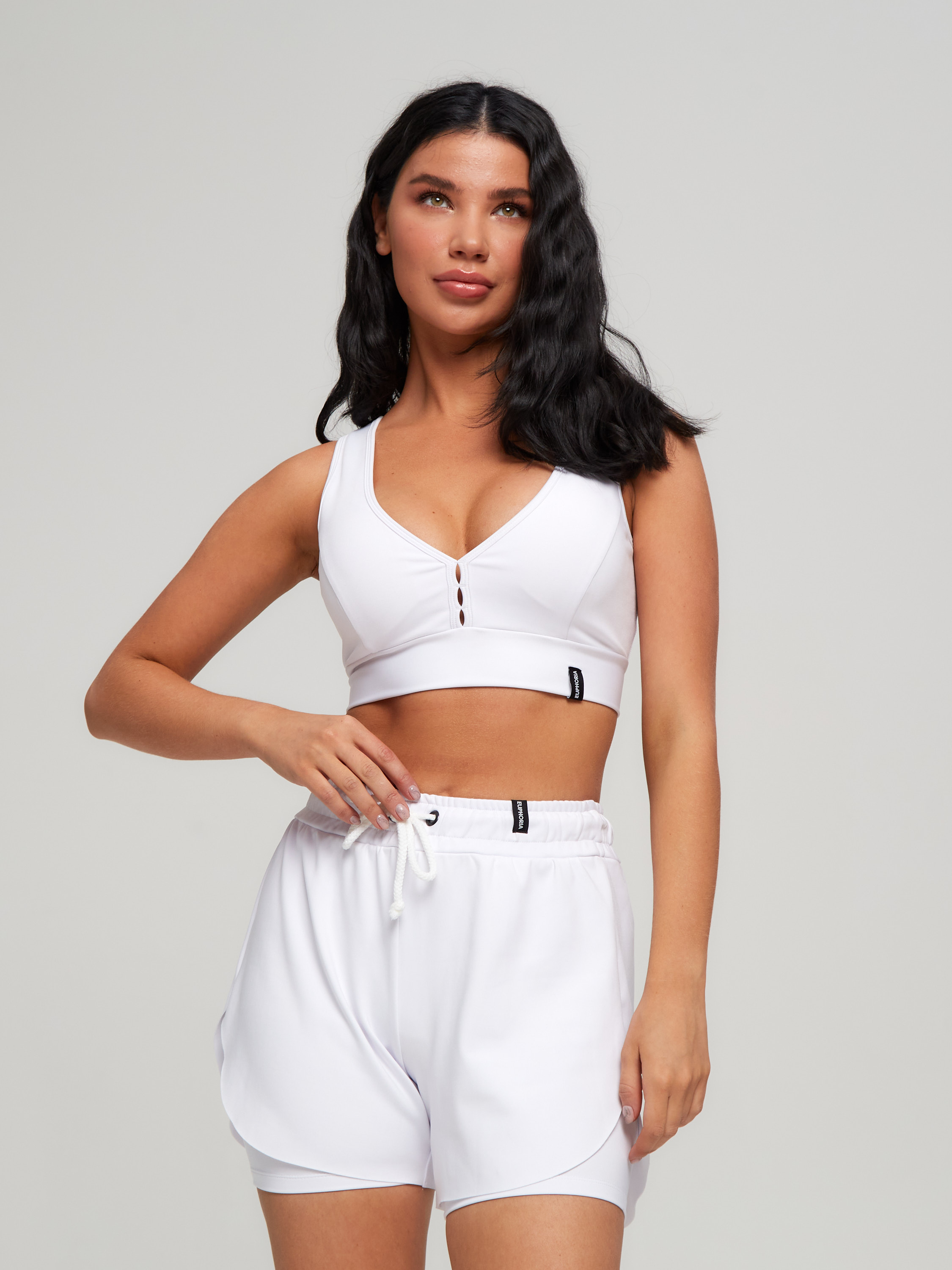 Шорты Twin Set White - универсальная модель, созданная для стильных образов. Трендовая многослойность обеспечивает максимальный комфорт во время тренировок. Плотный спортивный трикотаж не просвечивает и хорошо тянется во все стороны, полностью повторяя движения тела. Эластичная ткань хорошо отводит влагу и позволяет коже свободно дышать. Высокая анатомическая посадка на талии оснащена резинкой умеренной плотности и шнурком. По бокам имеются аккуратные фигурные разрезы, которые служат интересным динамичным акцентом. Изделие идеально подойдет для занятий в тренажерном зале, бега, йоги или пилатеса.