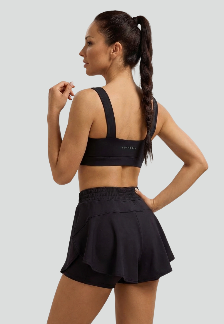 Верхняя часть представлена свободно сидящими шортами с широкой юбочкой, придающей изделию воздушность и элегантность. Ключевые характеристики верхнего слоя: