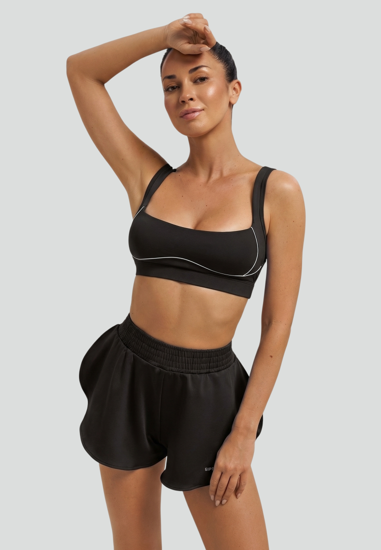 Нижняя часть выполнена в виде удобных облегающих шортиков, соответствующих стандартному дизайну спортивных шорт: